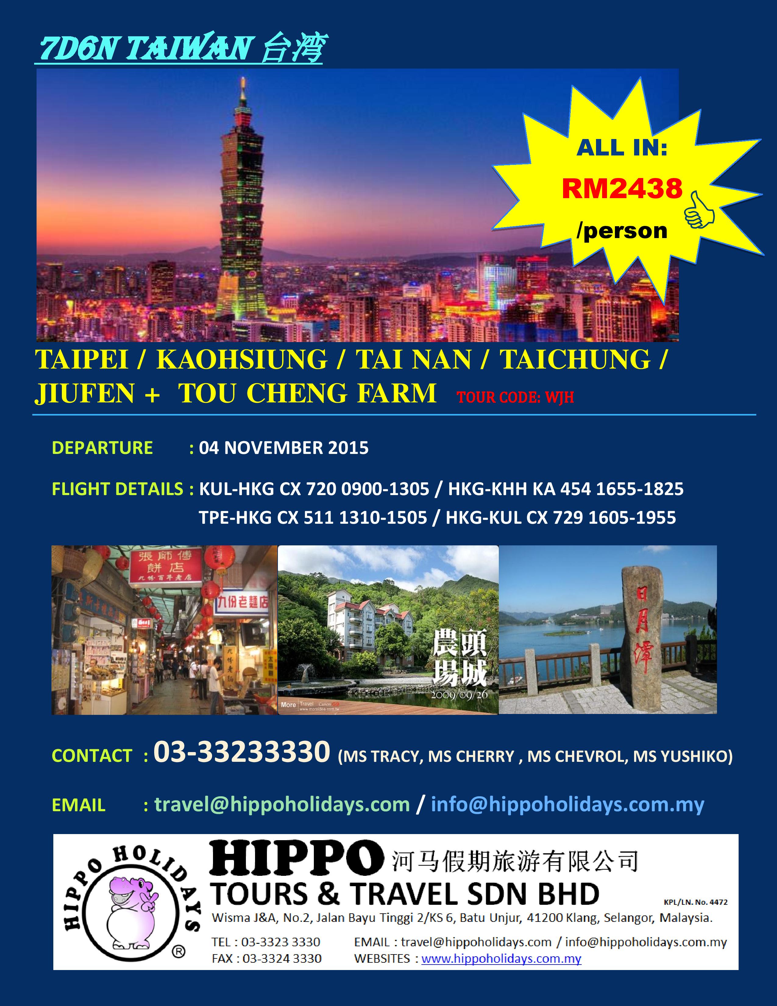 7D6N TAIPEI / KAOHSIUNG / TAI NAN / TAICHUNG / JIUFEN + TOU CHENG FARM 台北/高雄/台南/台中/九份 + 头城农场